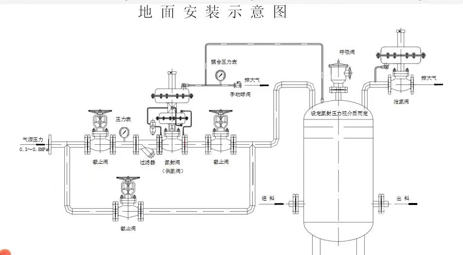 ■ 环保罐区VOCs回收氮封阀装置优化方案说明 ·一般供氮气压力在3×105~10×105Pa之间; ·罐顶呼吸阀仅起安全作用,是在主阀失灵,导致罐内压力过高或过低时,起到安全作用,在正常情况下不工作; ·泄氮阀安装在罐顶,口径一般在进液阀口径一致; ·一般泄氮阀的压力设定点略大于供氮阀的压力设定点,以免供、泄氮装置频繁工作,浪费氮气、影响设备使用寿命。 ·若用户工况有与选型手册有异,望来电与本厂技术开发部联系,协商解决。 ■ 连接尺寸及标准·连接方式:法兰、螺纹 ·法兰端面距:按GB12221-89标准 ·法兰标准:按GB/T9113-2000标准 ·法兰面型式:RF ·执行机构气信号接口:M16×1.5 注:以上数据可根据用户需要加工制造。
