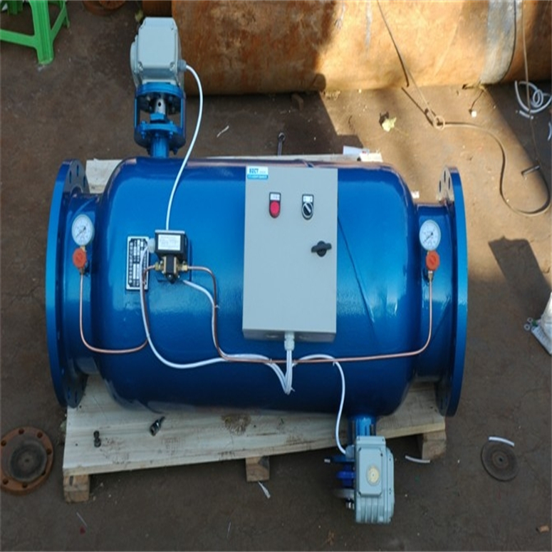 当过滤器工作时,水流导向阀处于开启状态,水流由入口进入过滤器,经过滤网过滤后流入出口。本机采用压差控制、定位控制自动清洗滤网。当过滤器进出口差压达设定值或定时器达到预置时间时,电动控制箱发出信号,排污阀打开(水流导向阀处于开启状态),水流冲洗粘在滤网内壁上的杂质被进一步冲洗排出,当水流导向阀处于全关状态下,水流被迫从过滤器进口段网孔进入滤网外侧,大部分净液从出口流出,一部分净液又从滤网外侧进入滤网内部(因为系统会处于泄压状态,滤网内部压力小于外侧压力),从而对滤网进行反冲洗,特殊结构的不锈钢契形滤网使得在滤网内部产生了喷射效果,任何杂质都被从光滑的内壁上冲走。当过滤器进出口压差恢复正常或定时器设定时间结束后,电动排污阀关闭,水流导向阀开启。整个冲洗过程系统可正常工作,无需停机。 自动反冲洗排污过滤器是一种用于低质水过滤的设备,同时也可用于其他需要过滤净化的工艺过程,它在滤筒的前段装有手动蝶阀,通过手柄调节阀板方向,可以改变水相对滤网的流向,阀板开启时过滤器处于正常工作状态,阀板关闭时过滤器处于反洗滤网状态,设备具有反冲洗方便,且体积小,过滤能力大,操作管理方便等优点。一般安装在供水前边、换热器或执行机构的前面,可不定期冲洗排除杂质,排污时不需停机操作。